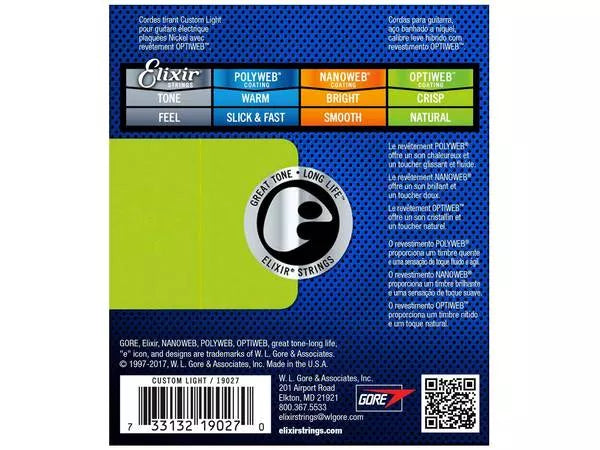 Grazie alla tecnologia Optiweb, Elixir offre corde per chitarra elettrica più sensibili e naturali. Destinate ai chitarristi che vogliono la stessa sensazione ed il suono di una corda non rivestita, le corde per chitarra elettrica Optiweb sono progettate appositamente per consentire alla corda di vibrare liberamente. Inoltre offrono una presa precisa sulle corde, che i chitarristi apprezzano per il bending e le tecniche di vibrato.
