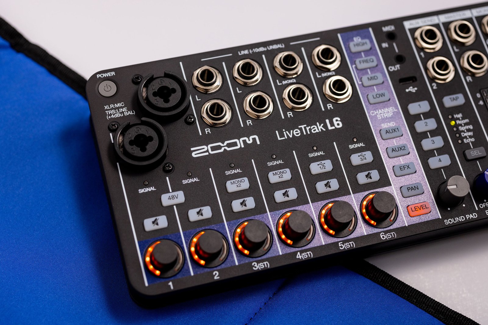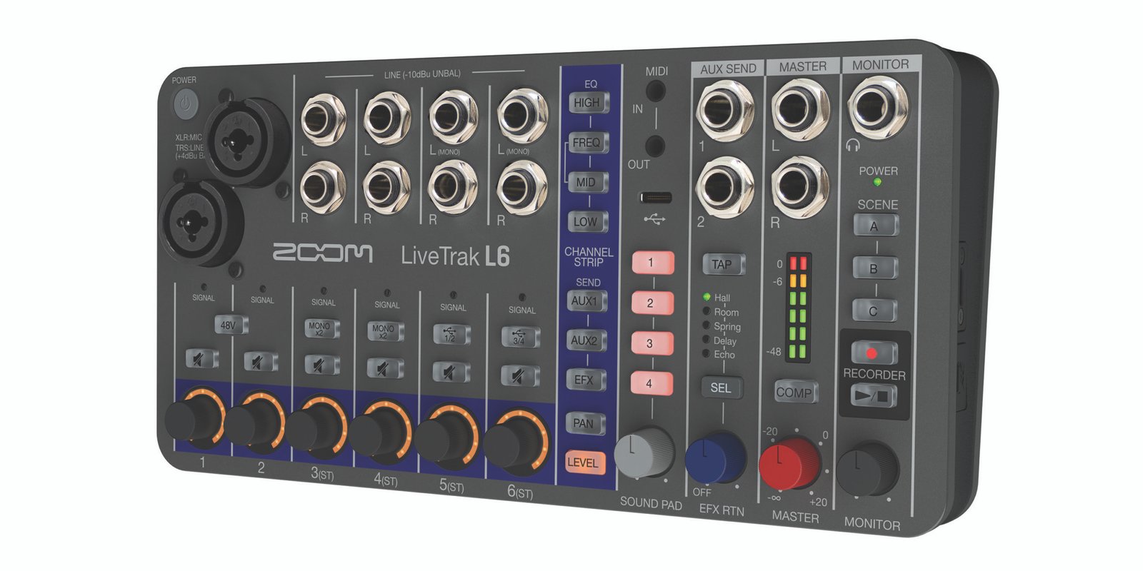 2 canali microfono/linea su combo jack XLR con alimentazione phantom – 4 canali stereo su 2 jack mono ciascuno – 4 pad assegnabili con controllo del volume- 1 uscita master su 2 jack TRS da 6,35 mm, 1 uscita monitor per cuffie su jack da 6,35 mm con controllo del volume – Impostazioni per ogni traccia: volume, pan, EQ a 3 bande con midrange semiparametrico, 2 mandate AUX e 1 mandata al effetto interno (5 effetti integrati) -Switch da Stereo a 2x Mono sui canali 3 e 4 – Switch feedback USB sui canali 5 e 6 – Compressore sull’uscita Master con regolazione dell’intensità, VU meter da 0 a -48dB – 3 Memorie di scena – Registrazione interna fino a 12 tracce (10 + master ), riproduzione a 2 tracce – modalità interfaccia audio USB 12-in/4-out – porta USB 2.0 tipo C – porta per scheda SDHC e SDXC fino a 1 TB – funzionamento fino a 32 bit/48 kHz, registrazione simultanea su computer e SD – Alimentata da 4 batterie AA (non incluse) o tramite porta USB – Fornita con adattatore di rete AD-17 e cavo USBintegrato